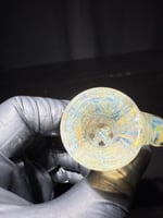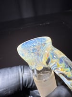 This new slide has four holes in the bottom with a super thick and vibrant silver with cane dots main bowl and silver stringer with fume handle